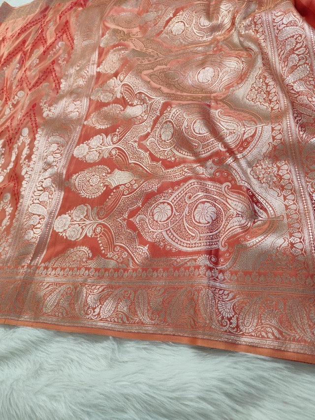 Crafted from Mashru silk, renowned for its durability and lustrous finish, this saree features the hallmark characteristics of Banarasi craftsmanship. The meenakari work—intricate enamel-like embellishments—adorns the fabric with refined detailing that catches light beautifully. The blush pink palette offers versatility for both traditional and contemporary styling.
